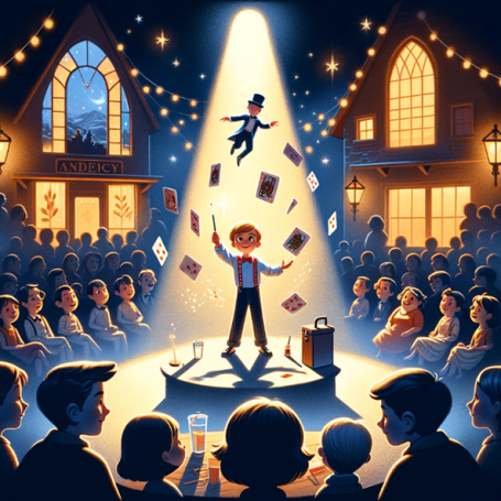 Der Abend der Talentshow war gekommen, und die Gemeinde versammelte sich voller Vorfreude im Rathaus. Als Leo an der Reihe war, betrat er mit einem selbstbewussten Lächeln die Bühne. Mit einer Handbewegung seines Zauberstabs wurde es im Saal dunkel, und der Zauber begann.