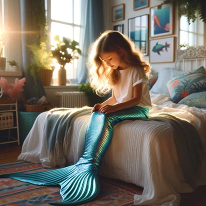 Am nächsten Morgen wachte Mia mit einem anderen Gefühl auf. Ihr Bett fühlte sich seltsam eng um ihre Beine an. Als sie versuchte, ihre Decke wegzuziehen, konnte sie es nicht. Panisch blickte Mia nach unten und erschrak. Anstelle ihrer üblichen Pyjamabeine war da ein schimmernder Meerjungfrauenschwanz, der im Sonnenlicht funkelte, das durch ihr Fenster fiel.